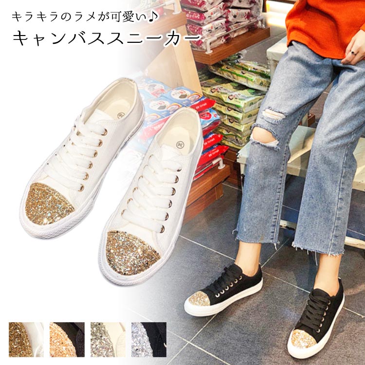 レディース スニーカー キャンバス ラメ キラキラ スパンコール 靴 おしゃれ 流行 可愛い 歩きやすい 疲れにくい ホワイト ブラック ゴールド シルバー 無地 小さいサイズ 大きいサイズ 軽量 春 夏 秋 冬 美脚 シンプル 快適